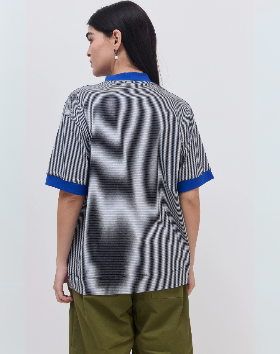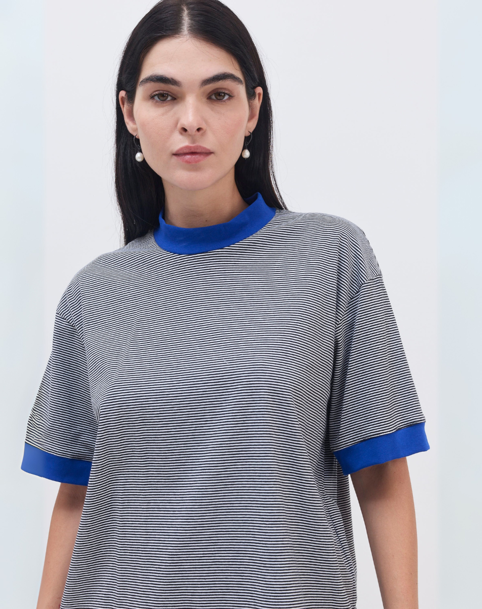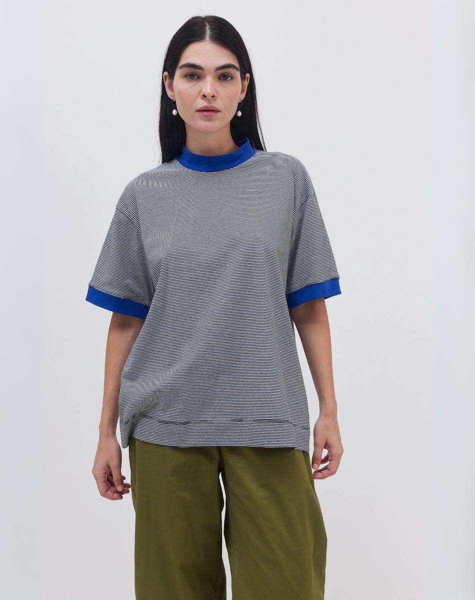 חולצת פסים מעוצבת בגזרה רחבה עם צווארון גבוה. ניתן לשלב עם חולצה מכופתרת מתחת למראה יותר לבוש.