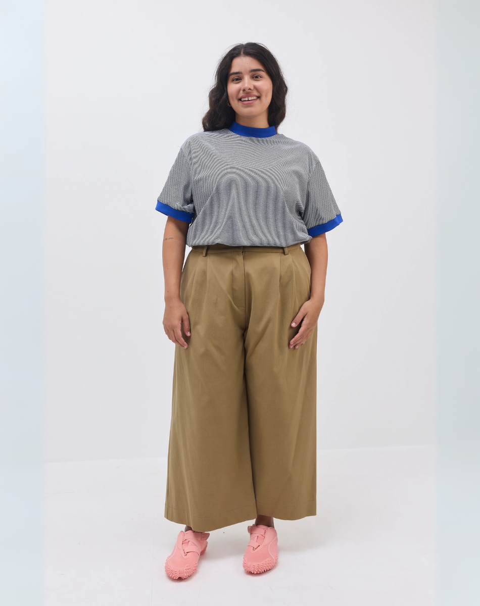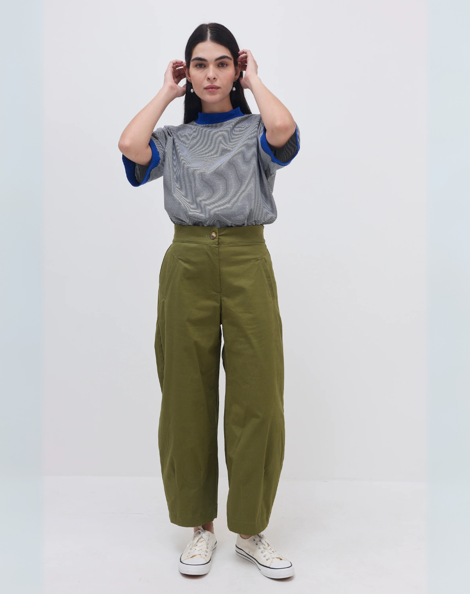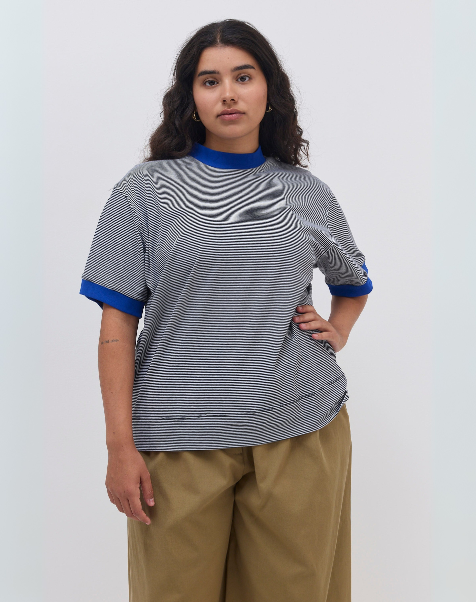 חולצת פסים מעוצבת בגזרה רחבה עם צווארון גבוה. ניתן לשלב עם חולצה מכופתרת מתחת למראה יותר לבוש.