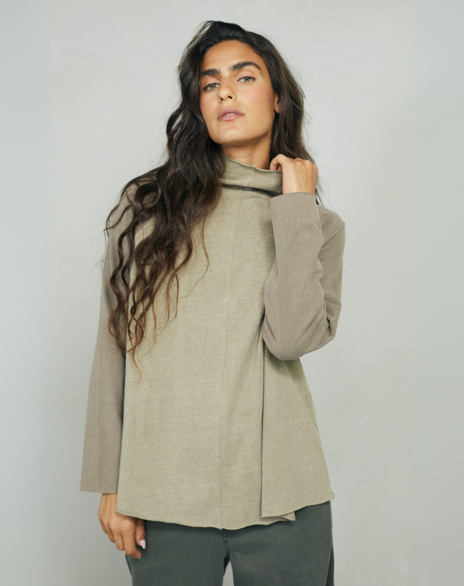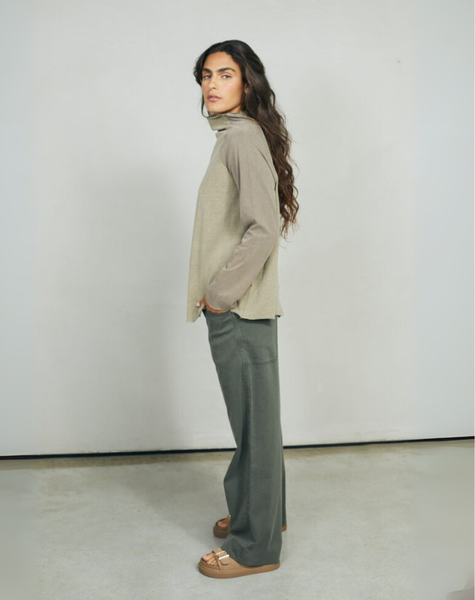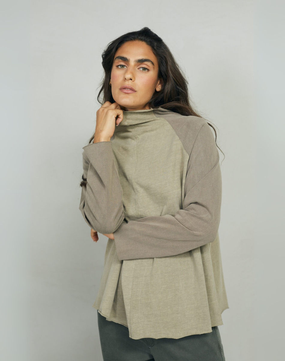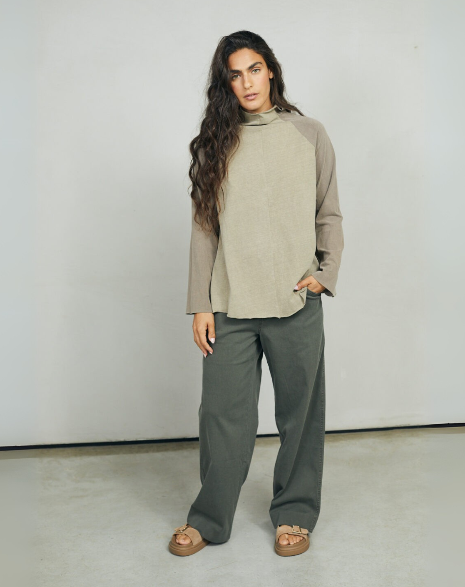 טופ גלוש זו ההתמכרות החדשה שלכן. גזרת רגלן הנוסטלגית במראה מרושל אבל מדויק ומוקפד. רחוקה מהגוף אבל לא OVERSIZE , קצוות ללא תפר שמאפשר את גלגול הבד. גוף החולצה והשרוולים לא באותו הצבע, מה שיוצר עניין, אבל שומר על פלטת הצבעים ולא מקשה בהתאמות.