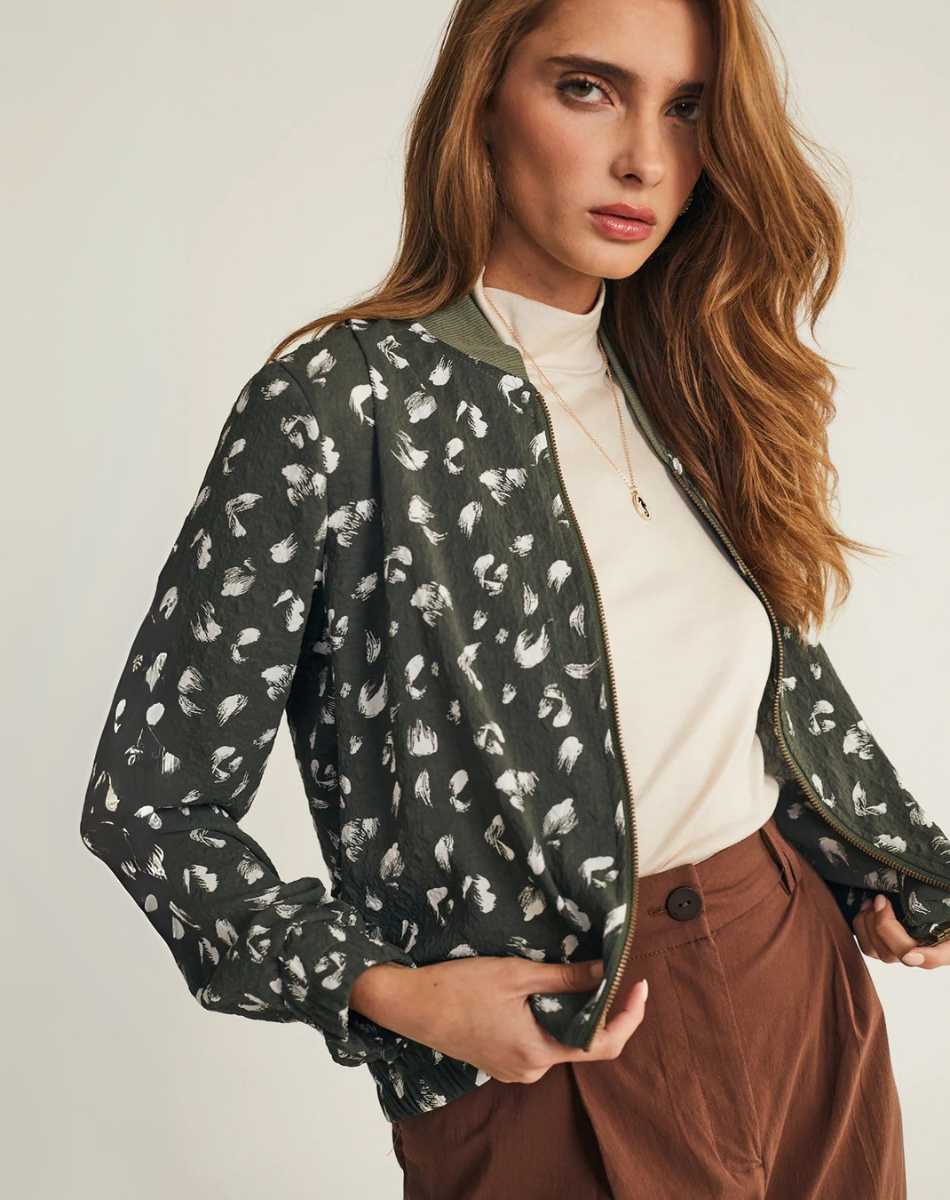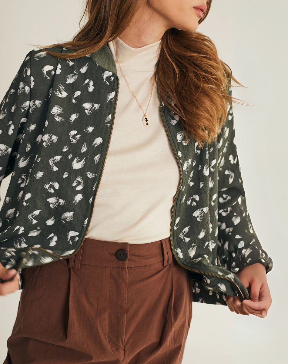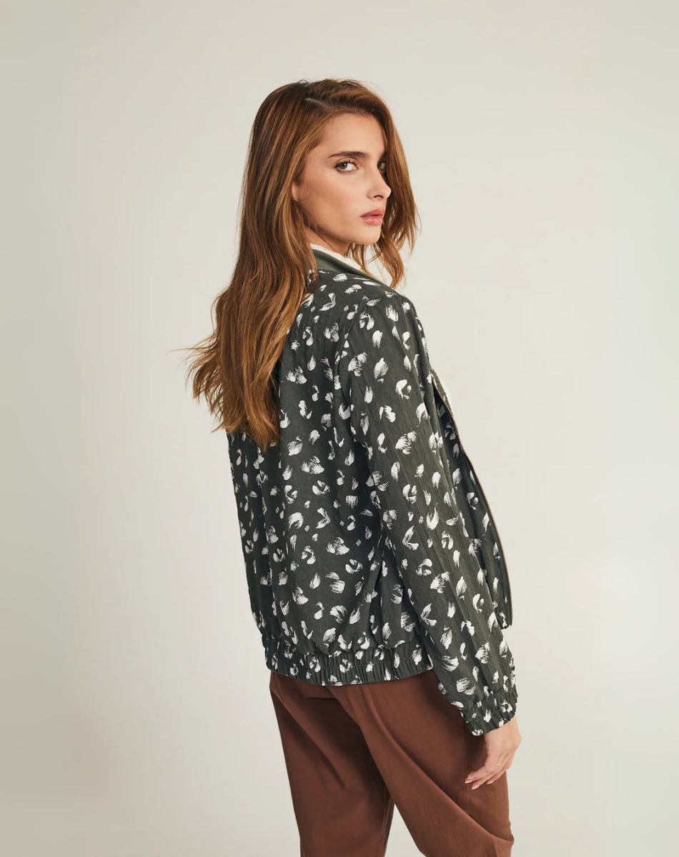 עליונית קלילה בגזרת בומבר אלגנטי ומחמיא. הדפס משיכות לבנות על רקע ירוק זית. גזרה משוחררת ונינוחה, שרוולים ארוכים. כיסים, רוכסן קדמי. גומי במותן ובשרוולים, מנג׳ט ריב בצווארון. עשוי מאריג סינטטי דקיק בטקסטורת פופקורן.