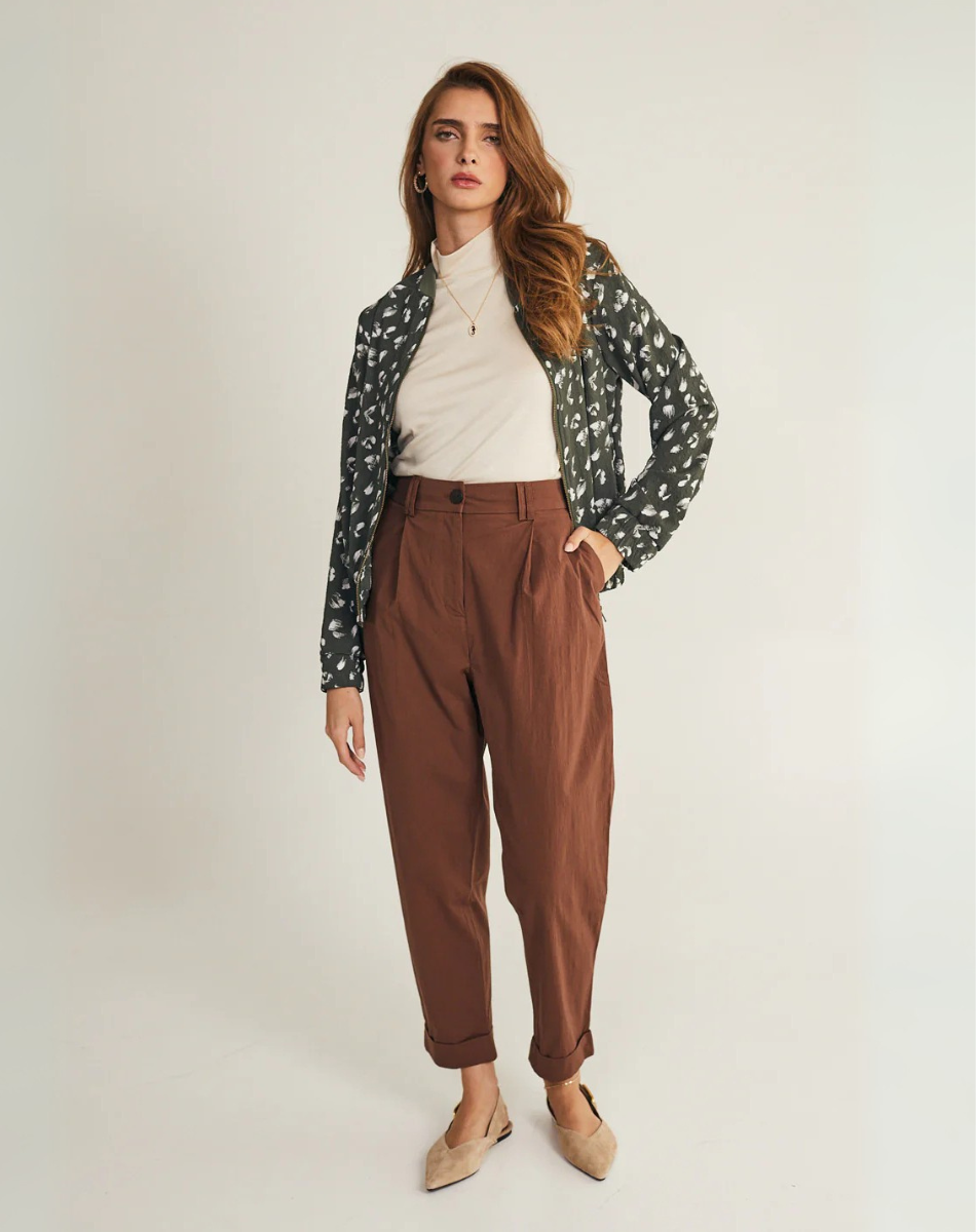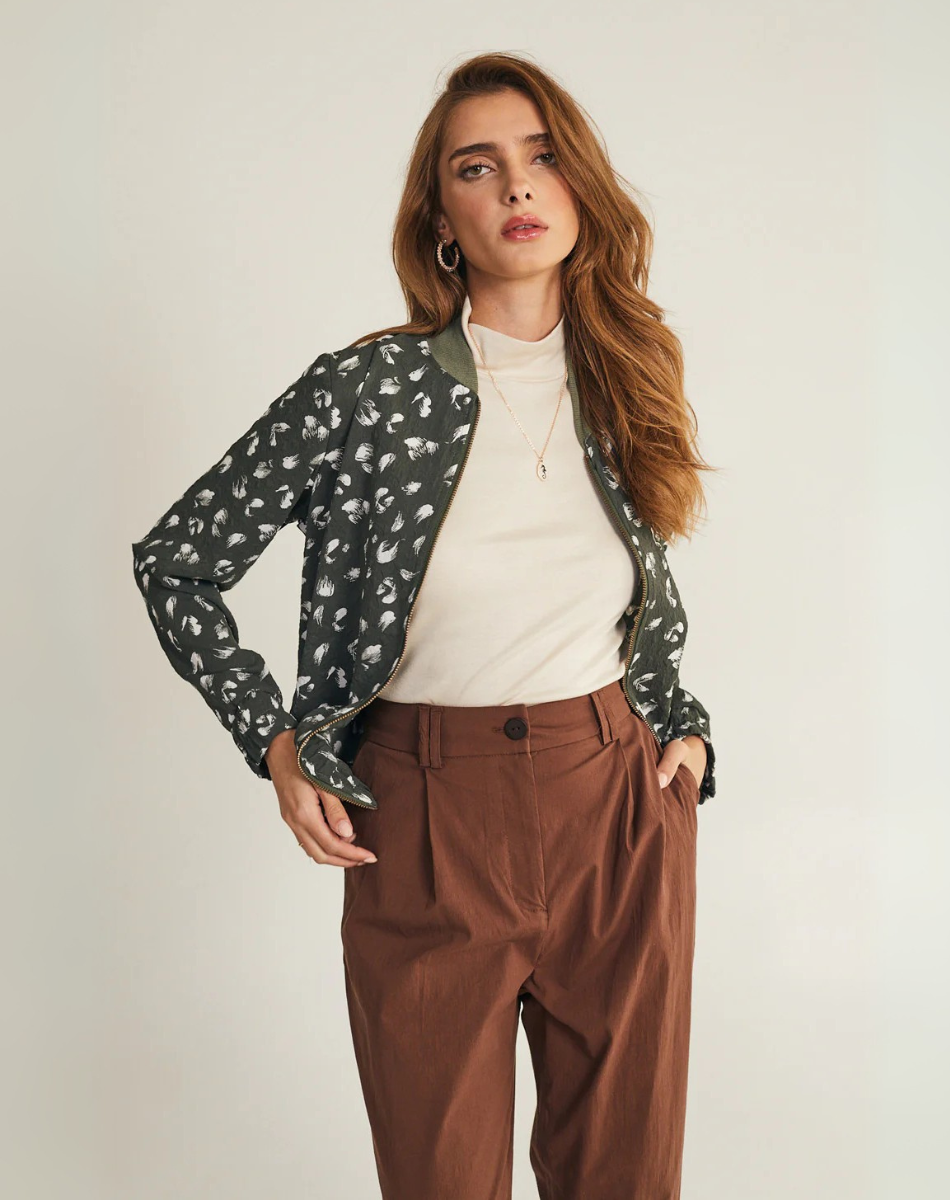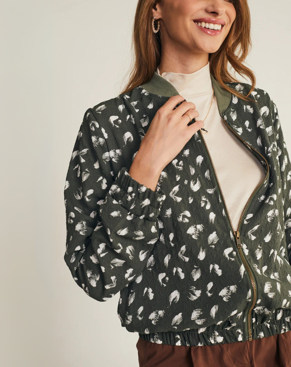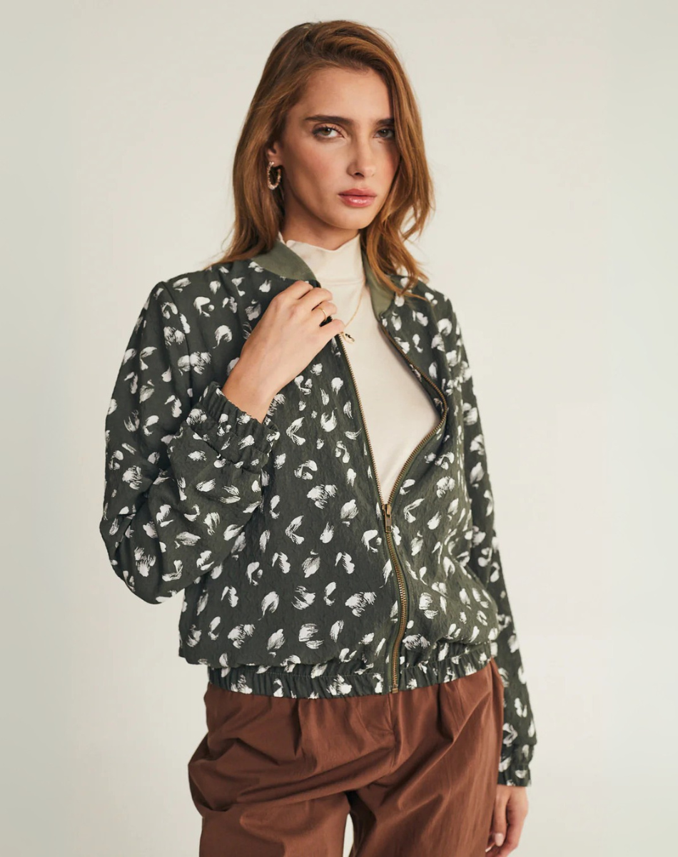 עליונית קלילה בגזרת בומבר אלגנטי ומחמיא. הדפס משיכות לבנות על רקע ירוק זית. גזרה משוחררת ונינוחה, שרוולים ארוכים. כיסים, רוכסן קדמי. גומי במותן ובשרוולים, מנג׳ט ריב בצווארון. עשוי מאריג סינטטי דקיק בטקסטורת פופקורן.