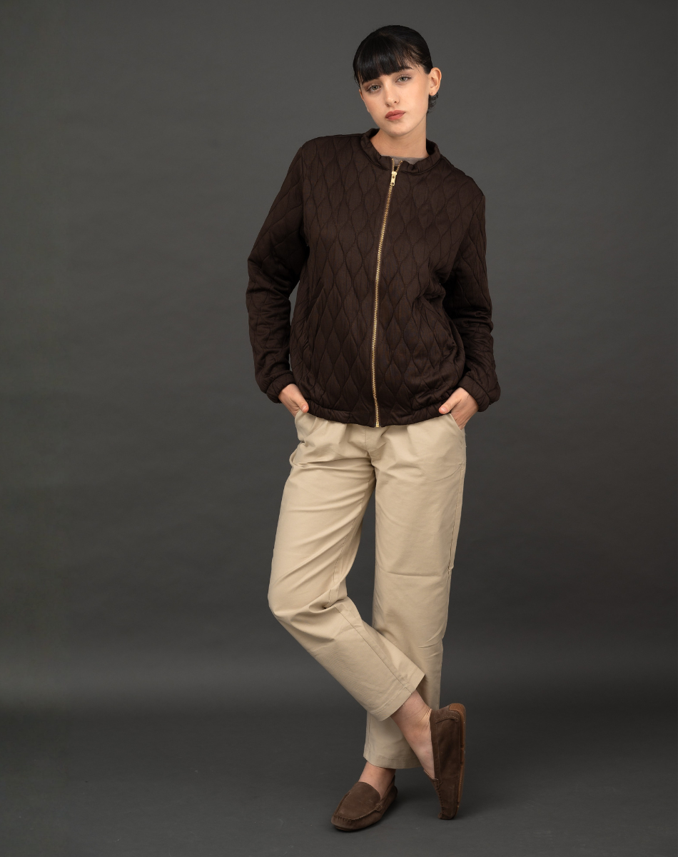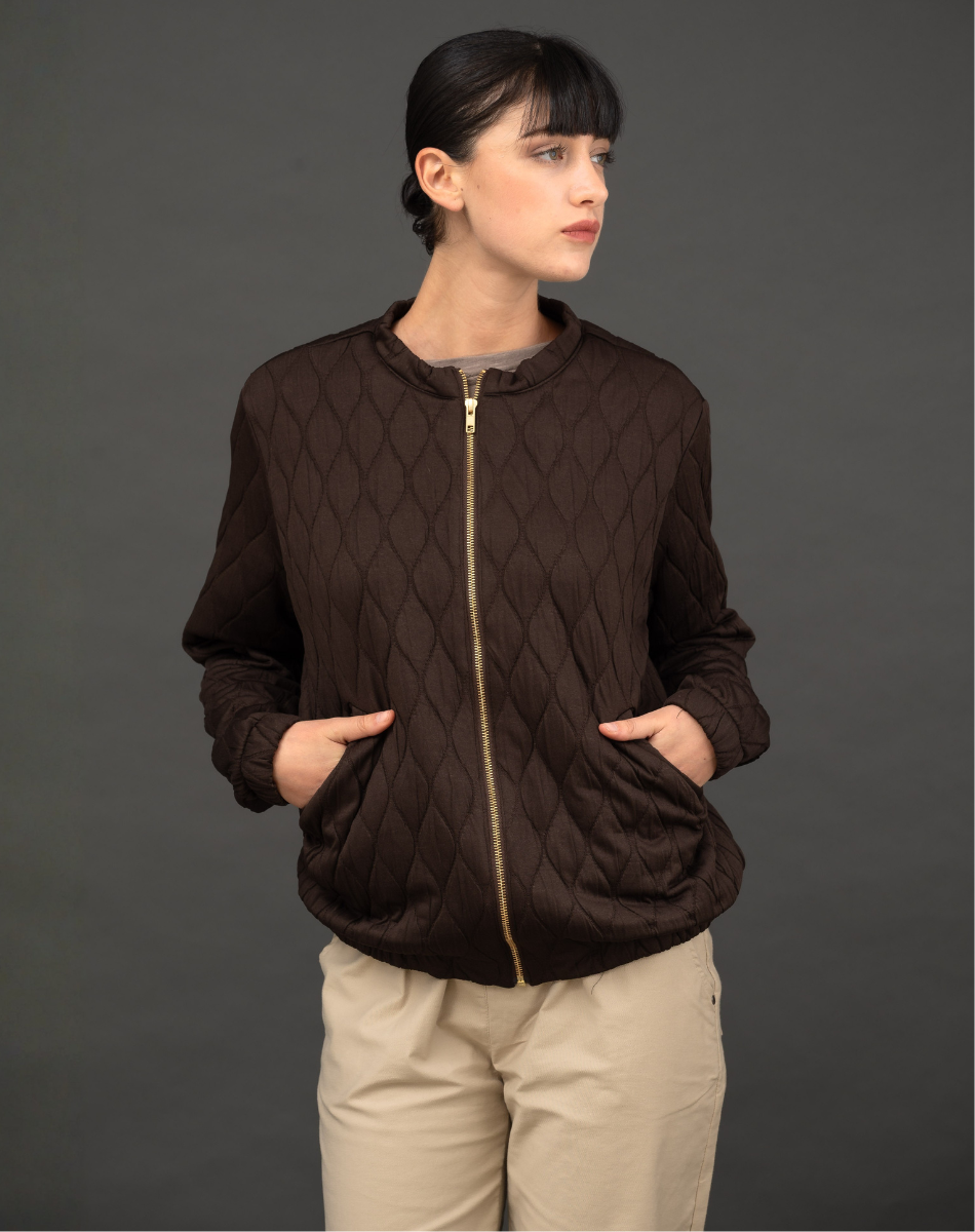 מחיר מקורי ₪478.00מעיל קצר בגזרה נקייה ומודרנית, עשוי בד מרופד בדוגמת קווילט עדינה למראה אלגנטי ומוקפד. נסגר ברוכסן קדמי בגוון זהב, עם צווארון עגול רך ושני כיסים קדמיים נוחים. המעיל קל ונעים ללבישה, מתאים לשכבות מעבר ולעונות הסתיו והאביב, ומשתלב בקלות עם מכנסיים או ג’ינס לסטייל יומיומי מעודכן.