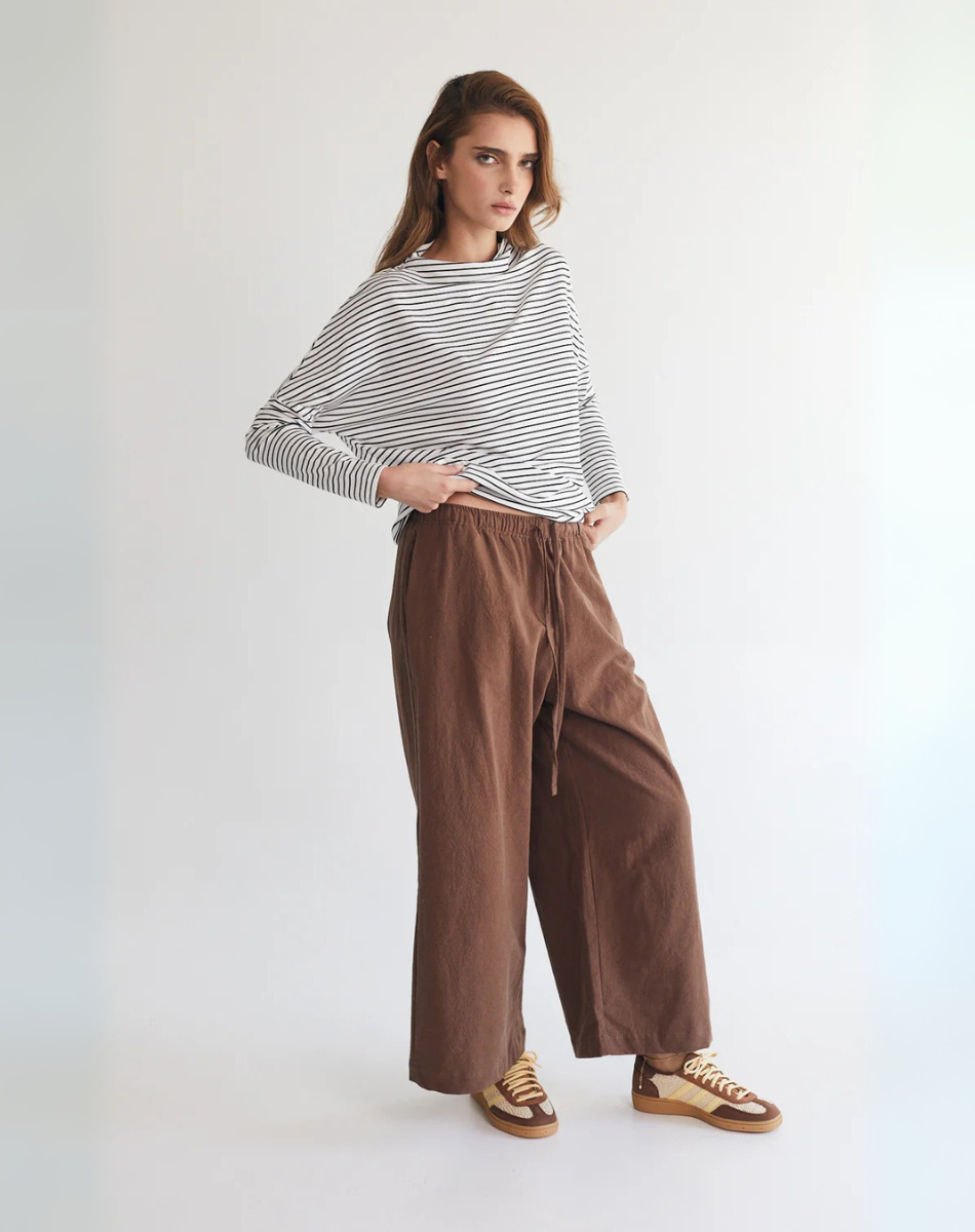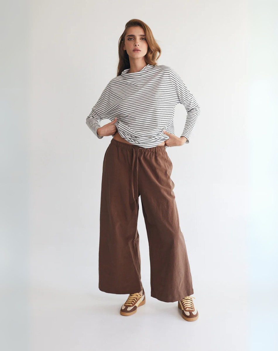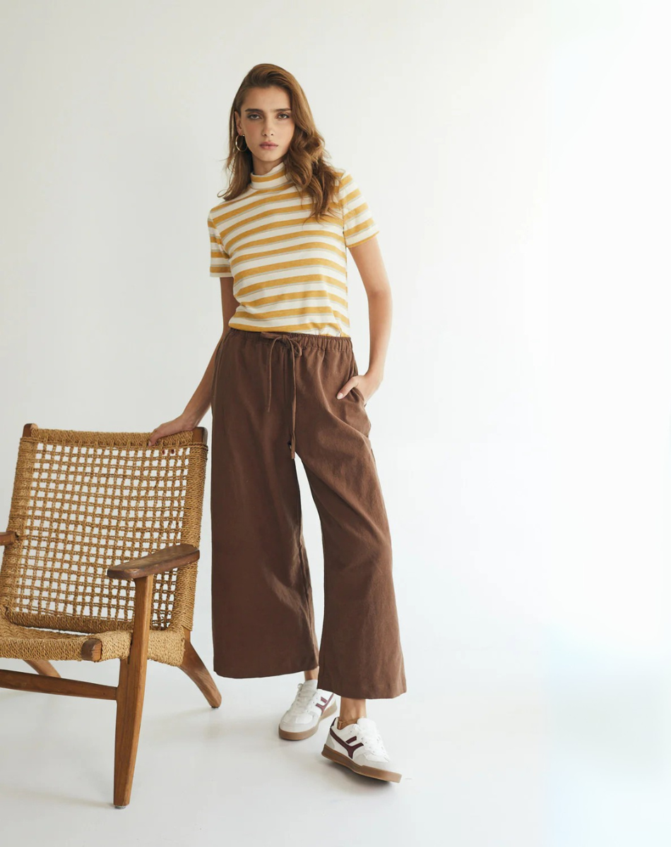 מכנסיים בגזרה משוחררת מתרחבת, באורך שהוא בול במקום הנכון מעל הקרסול. עם כיסים קדמיים, גומי במותן ושרוך להתאמה מרבית. נוחים, מחמיאים וכייפים.