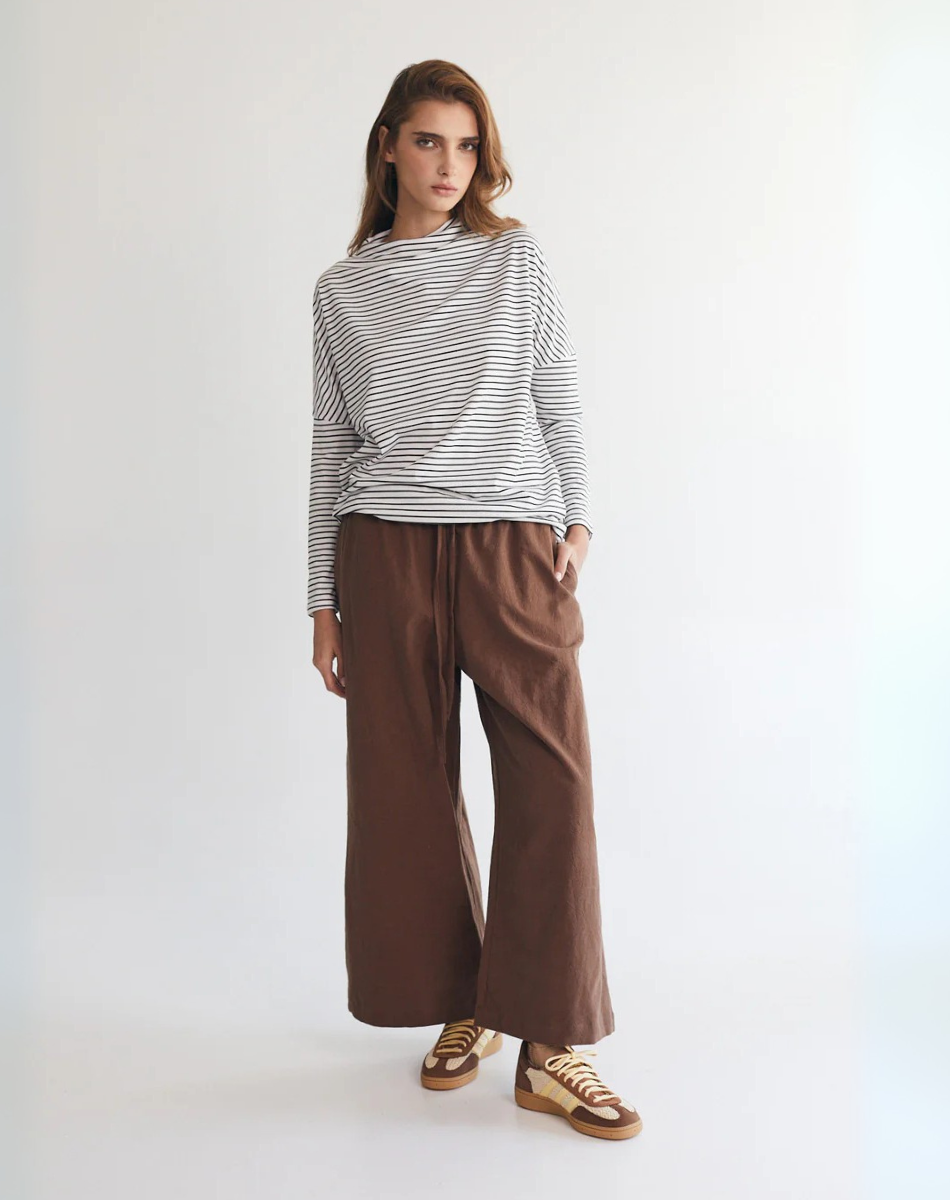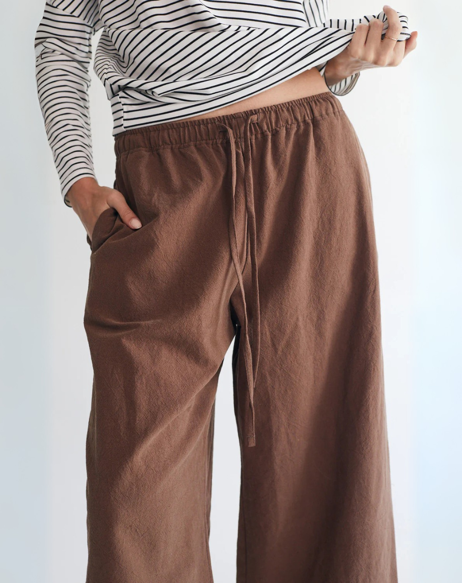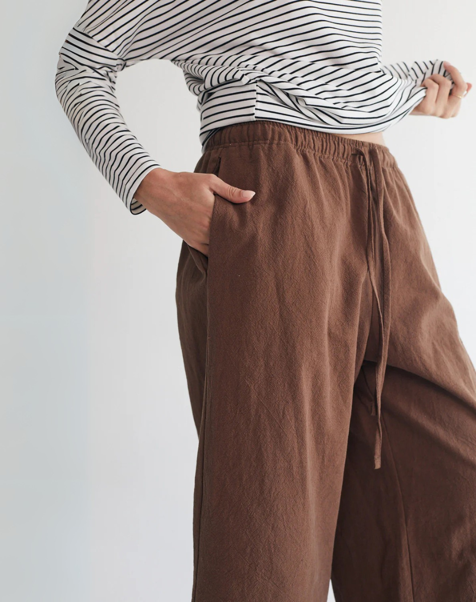 מכנסיים בגזרה משוחררת מתרחבת, באורך שהוא בול במקום הנכון מעל הקרסול. עם כיסים קדמיים, גומי במותן ושרוך להתאמה מרבית. נוחים, מחמיאים וכייפים.