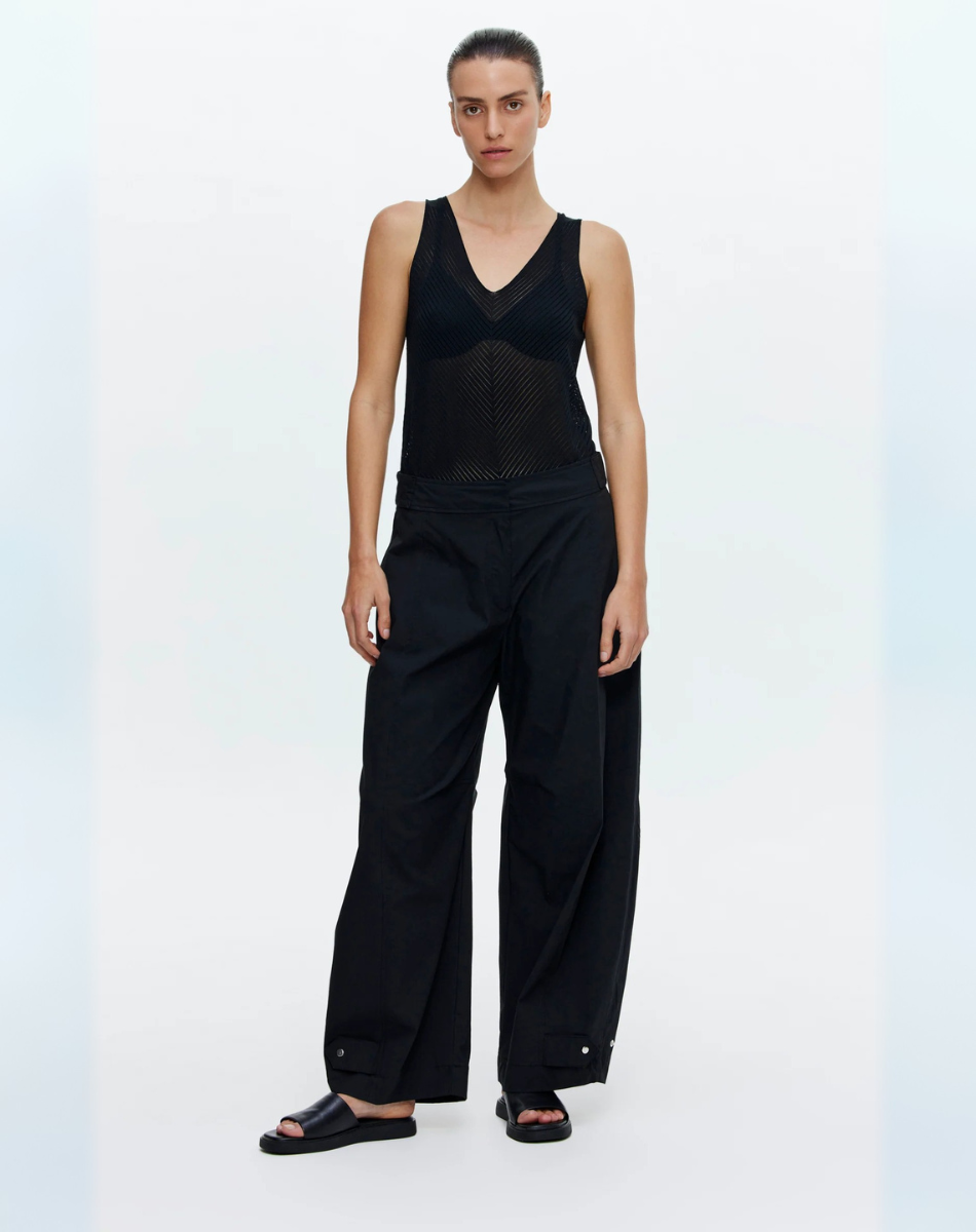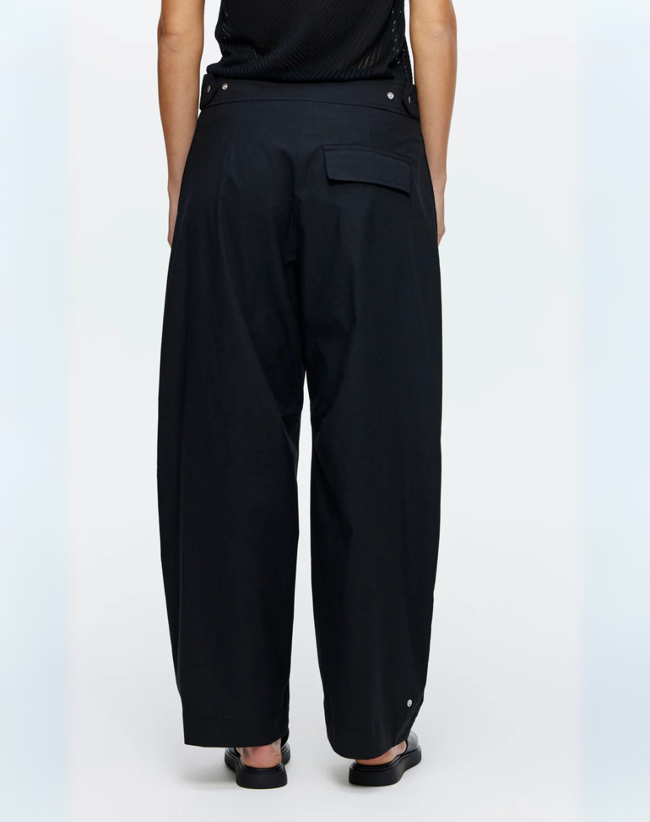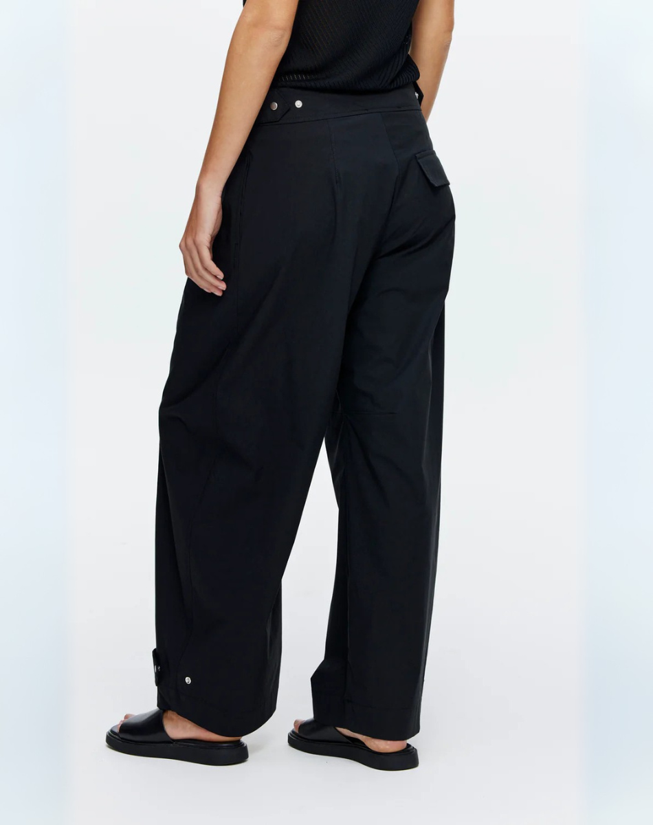 מכנסיים בעיצוב מינימליסטי יפני, בגזרה רחבה ומשוחררת. יש להם אלמנט כפתורים להדגשת והצרת המותן, זוג כיסים צדדיים וכיס אחורי בודד. המכנסיים מתכווננים בעזרת רצועות וכפתורים ליצירת מראה משתנה – ישר ורפוי או אסוף ומחודד. מתאימים לשילוב עם חולצות בסיס, גופיות או סריגים קלים לסטייל אורבני ונינוח.