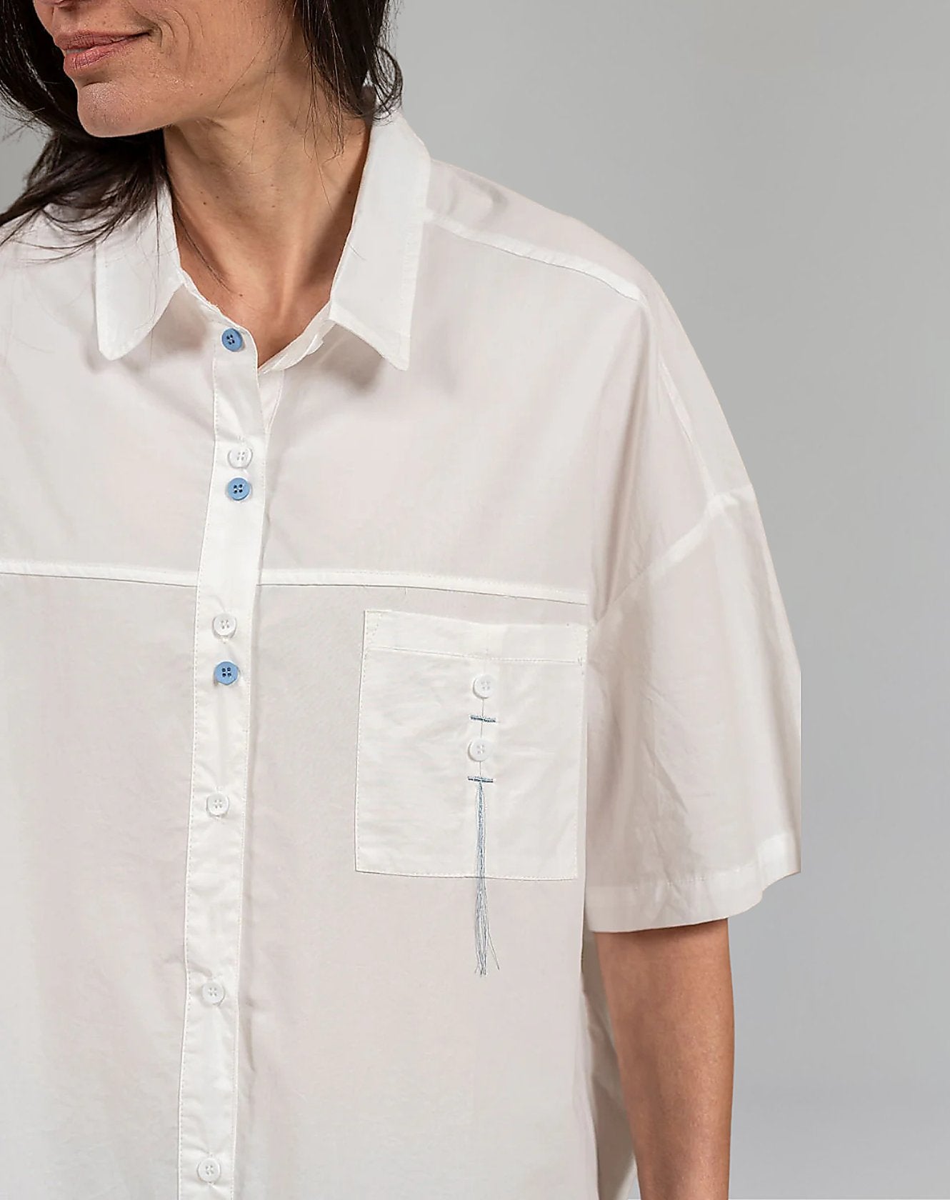 כיס קדמי עם כפתורים וחוטים משוחררים שנותנים נקודת עניין שקטה.