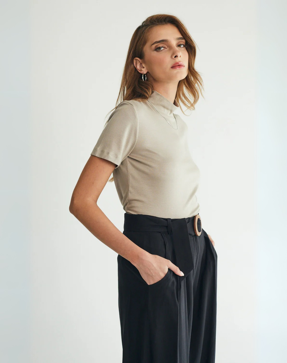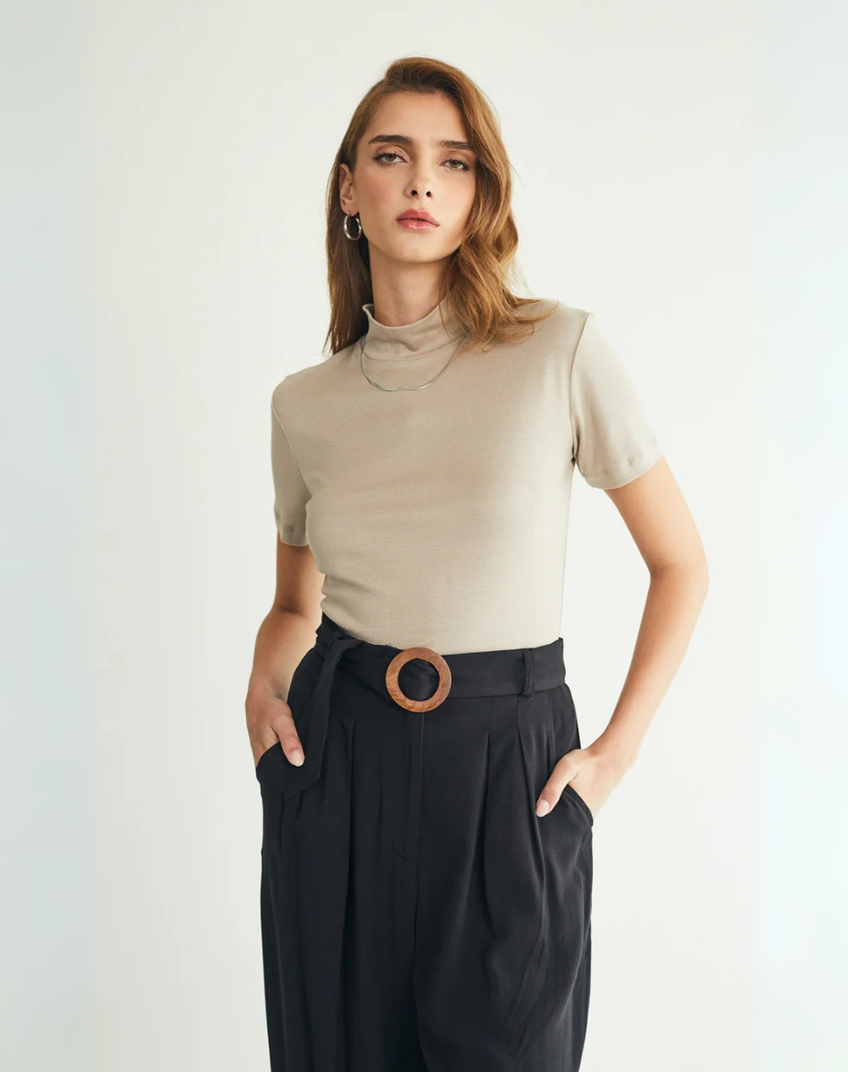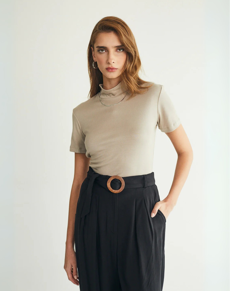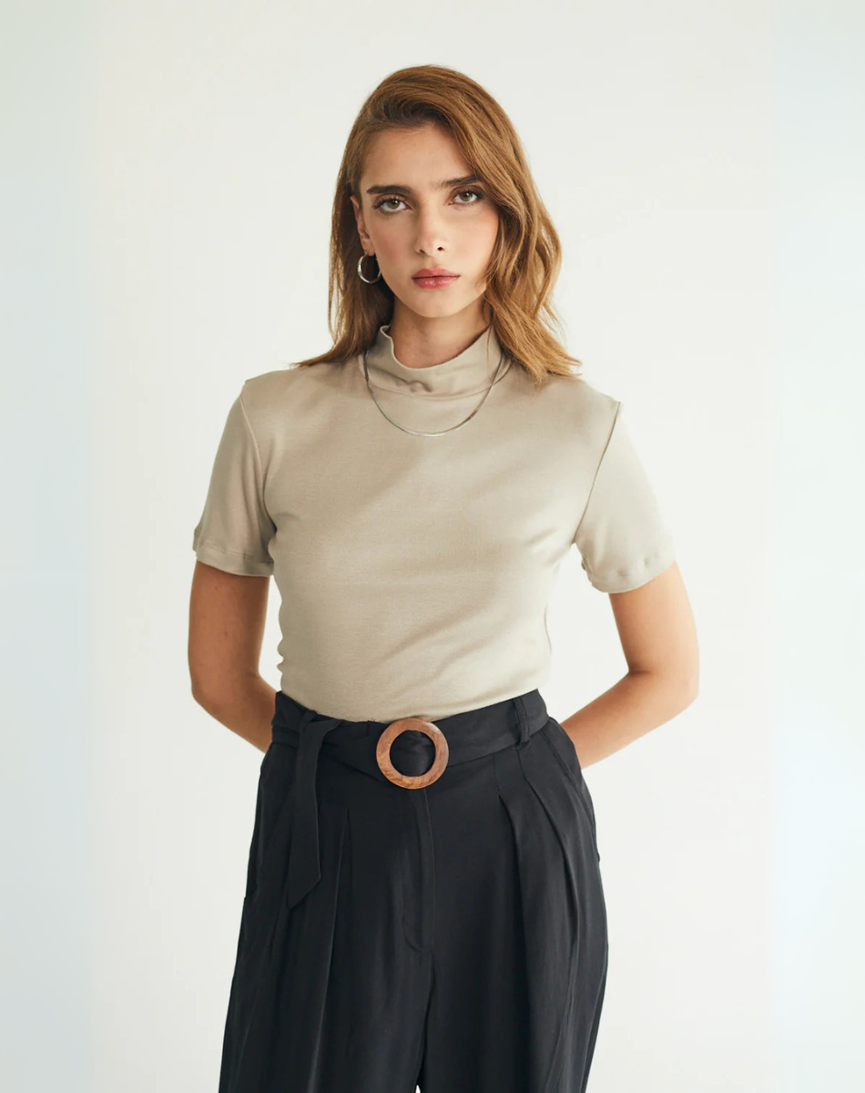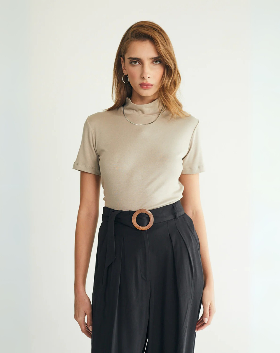 חולצת סריג גולף דקה וקצרה. חולצת בייסיק מצויינת בדיוק לעונת המעבר. גזרה צמודה עם שרוולים קצרים וצווארון גולף מחמיא.