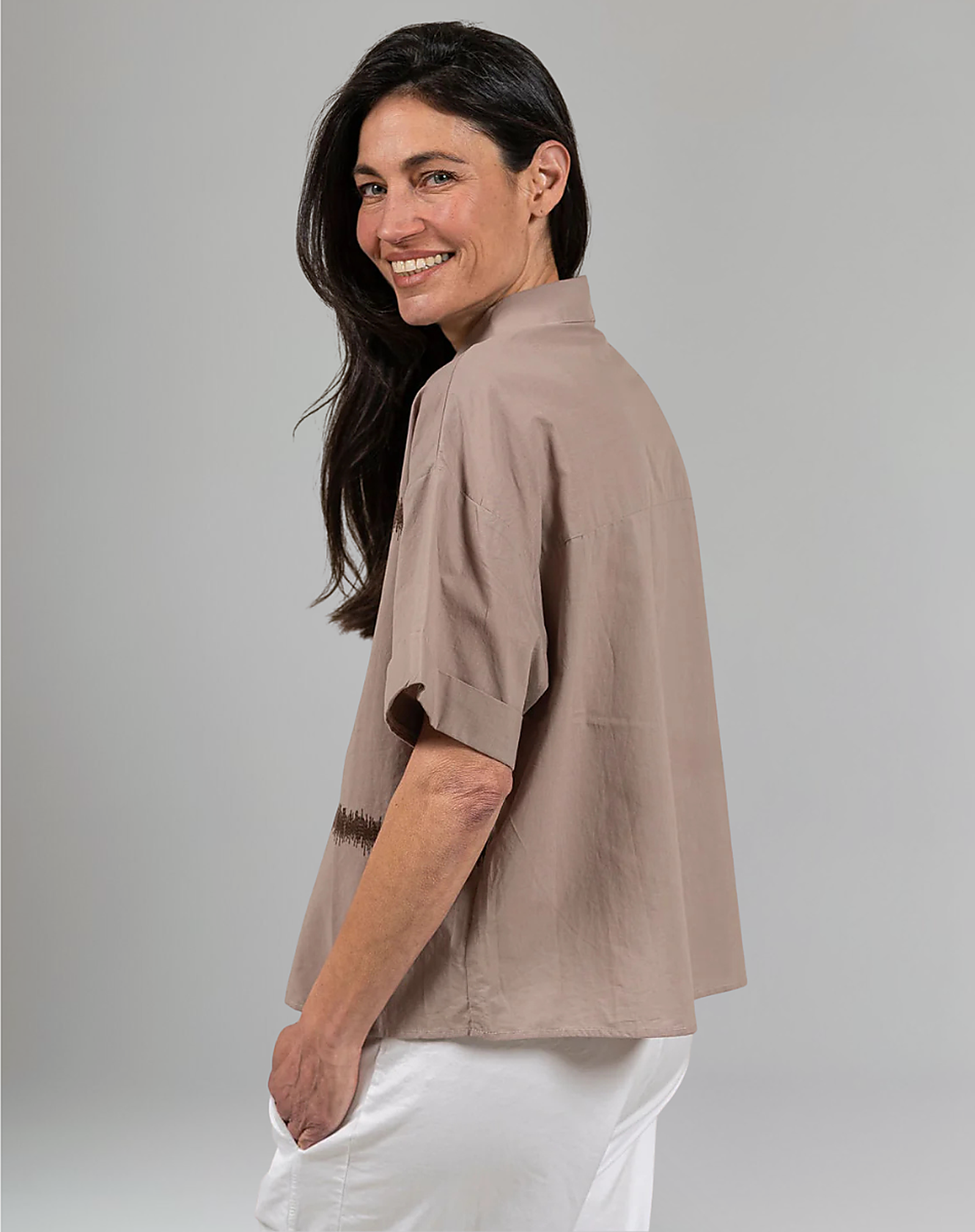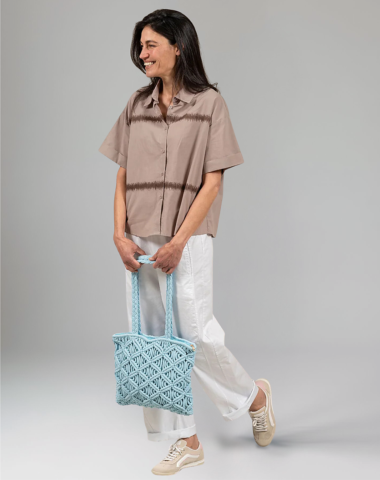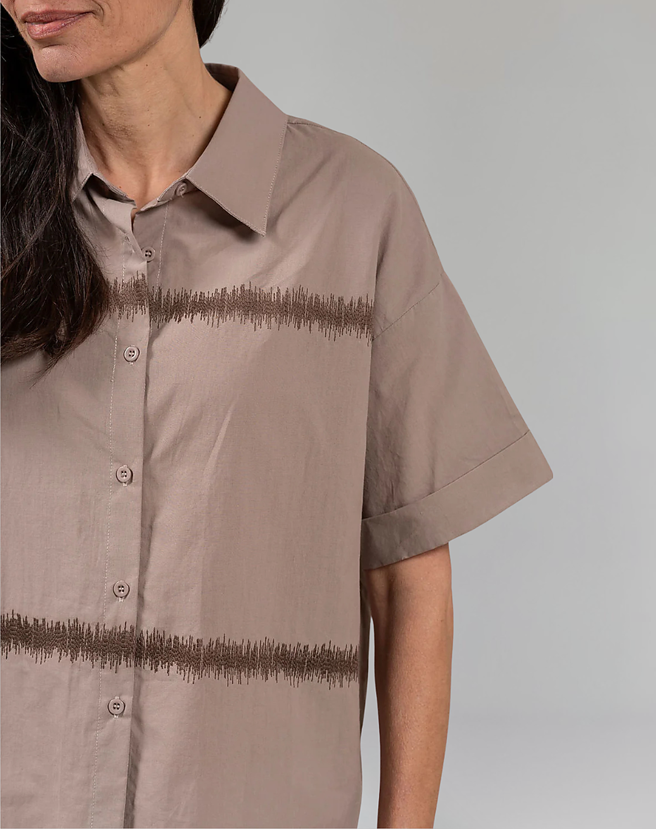 רקמות זיגזג אופקיות שמוסיפות תנועה ועומק. שרוול מקופל ותפור.