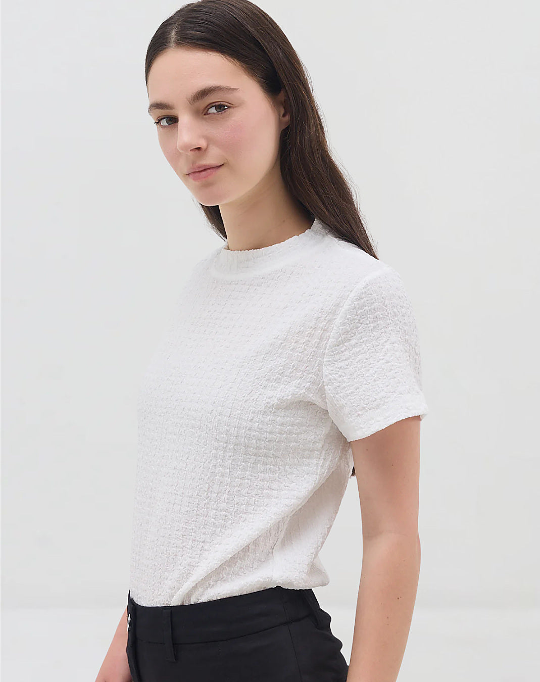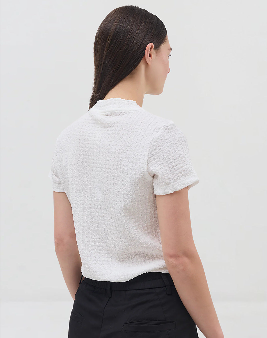 חולצה עם שרוולים קצרים, צווארון קטן, מבד עם טקסטורה נעימה בגזרה שמלווה את הגוף.